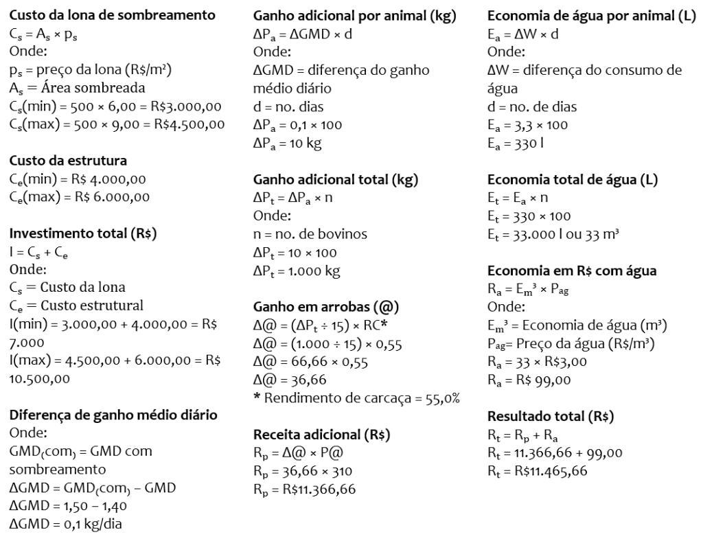 Suponhamos um confinamento com 100 bovinos. A recomendação de sombreamento é de 5,0 m² por animal e nesse sentido demanda cerca de 500 m² de área sombreada. Realizaremos então os cálculos hipotéticos, com base na literatura, sobre este cenário: